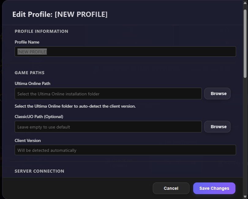 When ClassicUO opens, browse to your Ultima Online installation folder and create a new profile using the following settings: